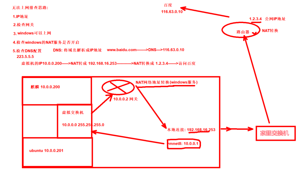 虛拟机的IP10.0.0.200-->NAT转成192.168.16253…>NAT转换成 1.2.3.4-…>访问百度
