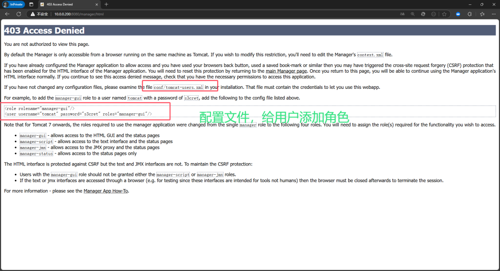 1.所有的管理页面,都将权限赋予给了角色,而角色的名称是固定的: manager-gui admin-gui