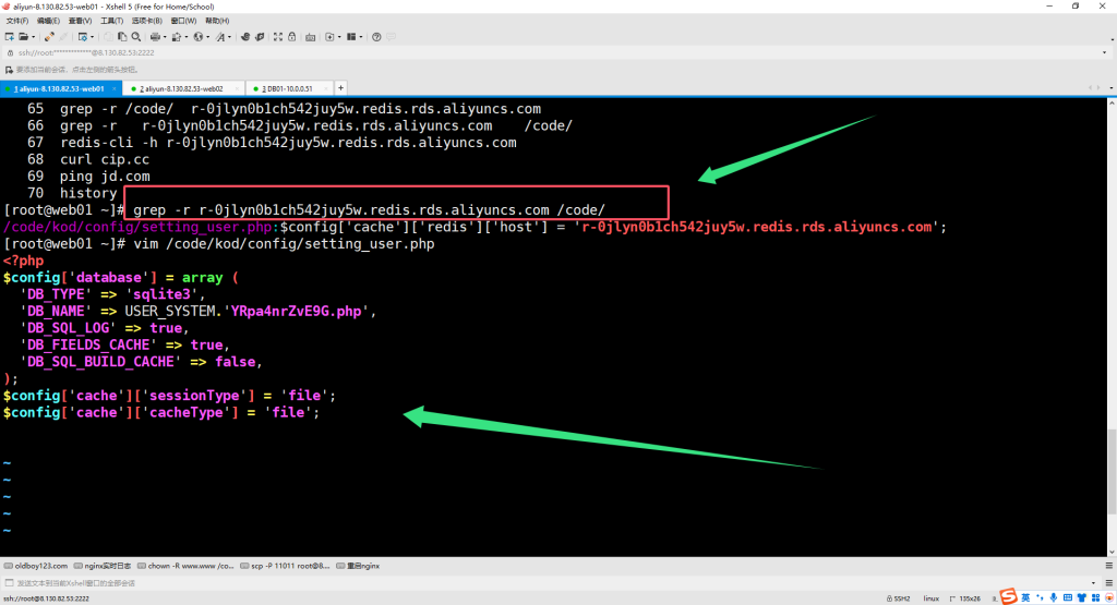 [root@web01 log]# grep -r r-0jlyn0b1ch542juy5w.redis.rds.aliyuncs.com /code/