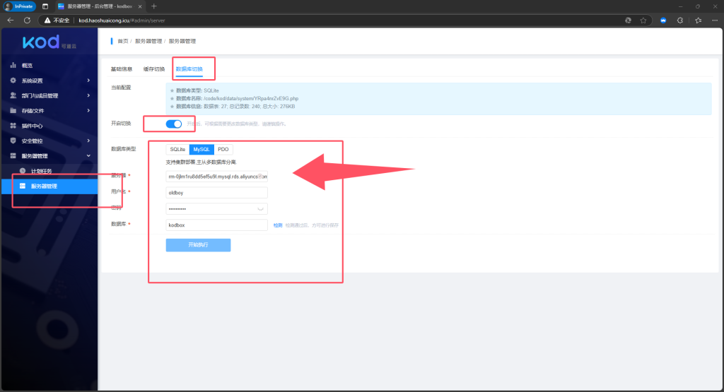 - KOD–>后台管理–>服务器管理–>数据库切换