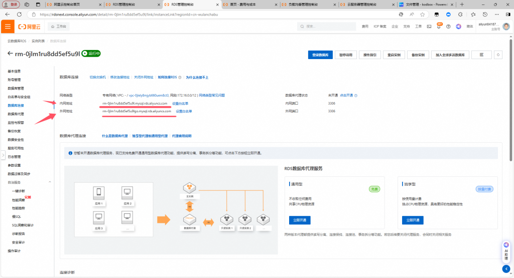 - 也可以申请公网地址连接阿里云数据库,但是无法免密,放行白名单,创建账号密码,才可以