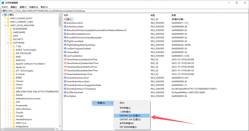 3.右击右边的空白区域,新建DWORD(32位)值(D),并以FlightSettingsMaxPauseDays命名