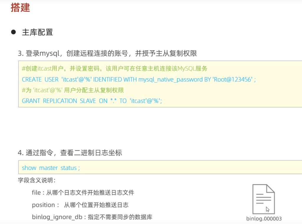 在主库上执行以下命令,获取主库的二进制日志文件名和位置: