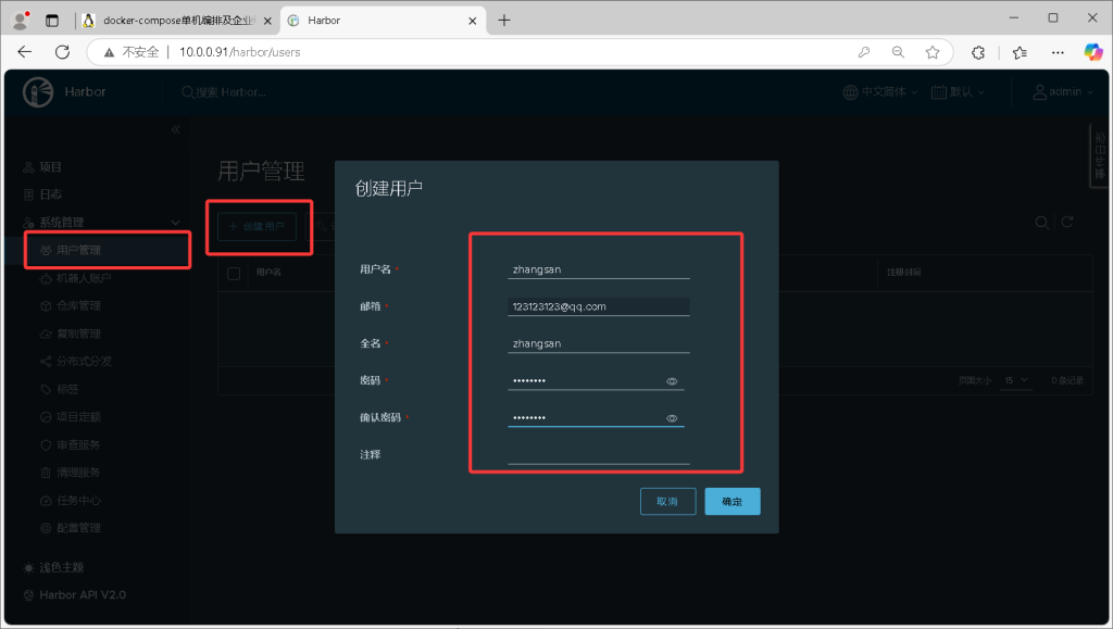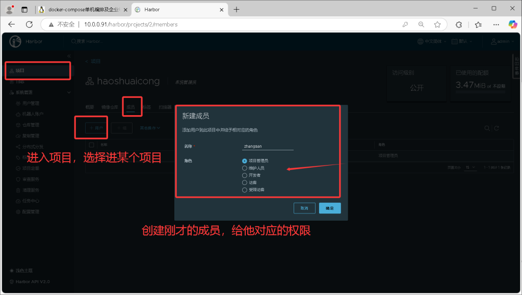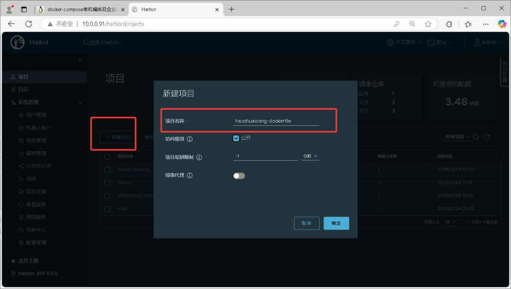 在浏览器中访问:http://10.0.0.91/harbor/projects/